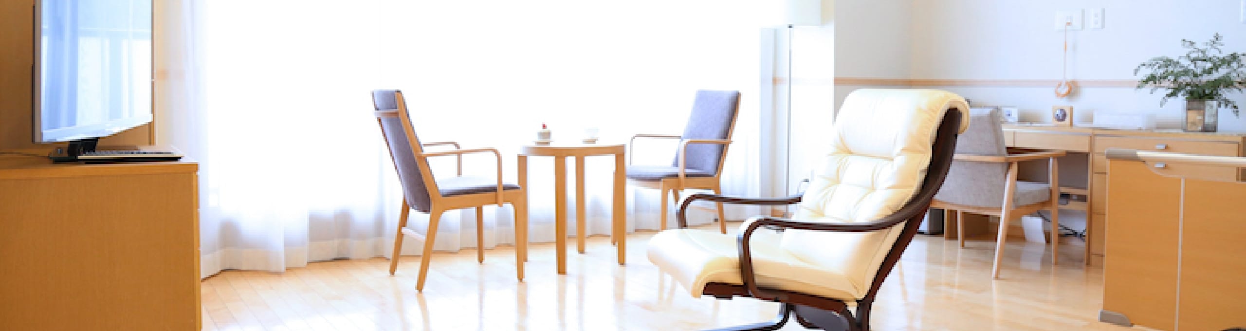 介護に重要な役目を果たす機能付き介護ベッドと空調管理のためのエアコン、レースのカーテンを設置しています。また、大容量の収納は居室内と居室外の2か所に設置しています。それ以外はオプションですので、愛着のある家具やテレビなどをそのままお使いいただけます。お二人用のタイプはお一人でもご利用頂けます。
